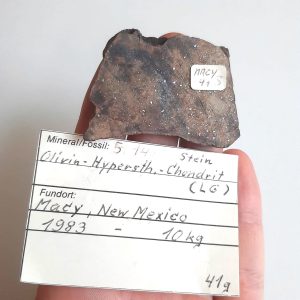 The nomads claimed that this meteorite was found to the south, in Algeria (~29º50’N 5º50’W), in the direction of a fireball seen in 1995 January. In 1997 September, the same nomads shipped a fragment of a meteorite that they claimed was seen to fall on 1997 August 10 to Mr. Edwin Thompson. In 1997 November, Thompson traveled to Mauritania and collected six fresh-looking stones totaling 200 kg at the base of the El Hammami Mountains in Mauritania (1000 km southwest of Mhamid, Morocco), probably in the place where they fell. Fragments of these have been sold by dealers under the name El Hammami. The total known mass of this fall is around 240 kg. It is classified as an H5 chondrite.
